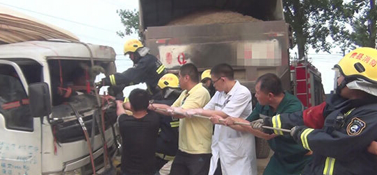 5月25日17時(shí)許,臨沂公安消防支隊(duì)費(fèi)城中隊(duì)接到報(bào)警,稱(chēng)費(fèi)縣薛莊鎮(zhèn)北山陽(yáng)路段,一個(gè)十字路口發(fā)生車(chē)禍,兩車(chē)相撞、一人被困駕駛室。現(xiàn)場(chǎng)的圍觀群眾自發(fā)幫消防人員一起救援,被困者被救出。